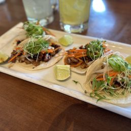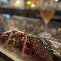 Great place for some shareable tapas! The chicken satay was amazing, so make sure you order 4 or you'll regret it (we only did three and wished it was four). The coconut shrimp with the mango rice was another great tasing dish! We tried the load potatoes and in comparison to the other two dishes the flavor was just so-so. Lastly we had the apple fritters, it was larger than we expected and tasted great. The amount of ice cream to fritters was a bit shy but they offered an additional scoop and was sufficient. We didn't take a photo but the neo old fashioned I had was a wonderful twist of a cocktail. Highly recommend the food, the staff and atmosphere.